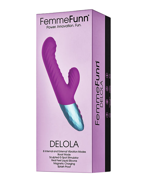 Delola, our dual-density rabbit vibe likes to tease and please. With a firm silicone core, silky liquid silicone body, and wavy texture, experience layers of sensation. 8 External & Internal Vibration Modes.Boost Mode. Sculpted G-Spot Stimulator. Real Feel Liquid Silicone. Magnetic Charging. Charge Time: Approximately 2.5 hour(s). Run Time: Approximately 70 minutes. Splash Proof. Materials: 100% premium quality liquid silicone. Measurement: 9.2” x 1.5”.